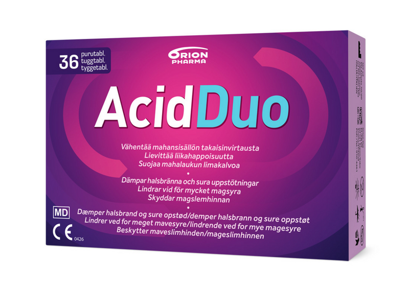 Acidduo purutabletit ovat tarkoitettu mahansisällön takaisinvirtauksen, hapon aiheuttaman polttelun ja näihin liittyvän raskaan olon lievittämiseen. Acidduo lievittää mahan liikahappoisuutta ehkäisten närästystä, vatsakipua ja happamuuteen liittyviä ruoansulatusvaivoja. Acidduo on tehokas valmiste riippumatta siitä, mistä vaivat johtuvat. Valmistetta voi myös käyttää gastriitin (mahalaukun limakalvon tulehduksen, ns. mahakatarrin) tukihoitona.