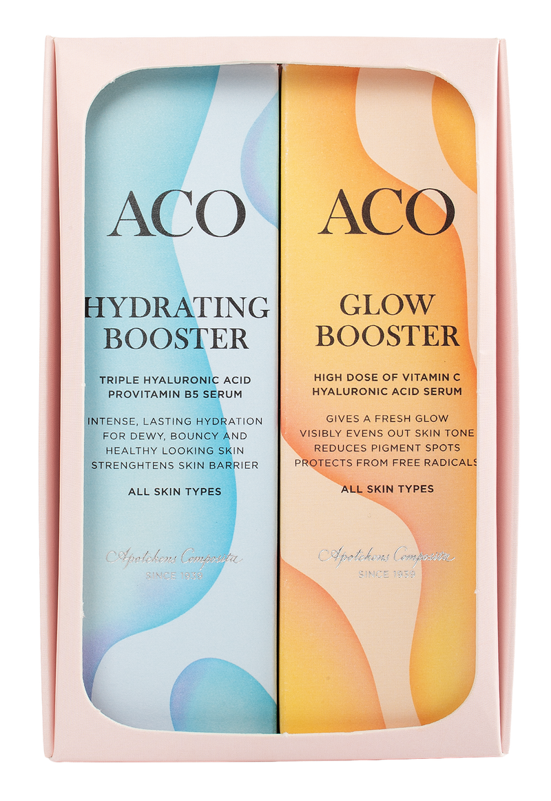 Pakkauksessa suosikkiseerumit ACO Face Hydrating Vitamin B Booster sekä ACO Face Glow Vitamin C Booster, mukana itse koottava lahjapakkaus.