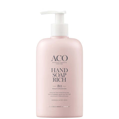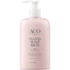 ACO Hand Soap Rich on erittäin täyteläinen ja hoitava käsisaippua, jossa on ihoa tasapainottava pH-arvo 4,5. Puhdistaa hellävaraisesti ja kosteuttaa käsiä 8 tunnin ajan. Jättää ihon välittömästi pehmeän ja sileän tuntuiseksi.