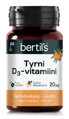 Suomessa kehitetty ja valmistettu raikkaanmakuinen bertil's tyrni-D3-vitamiinipurutabletti. Sisältää hyvin imeytyvän D3-vitamiinin lisäksi kliinisesti tutkittua erittäin korkean antioksidanttipitoisuuden omaavaa uuden sukupolven CyanthOx™-tyrnibioflavonoidiuutetta ja tyrninmarjajauhetta.