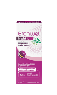 Bronwel Night yskänsiirappi on tarkoitettu flunssan yhteydessä esiintyvän öisen yskän hoitoon sekä äänen käheyteen, kurkun karheuteen ja nielemisvaikeuksiin, erityisesti öisin. Bronwel Night yskänsiirappi sisältää pääasiassa luonnollisia ainesosia. Sokeriton, alkoholiton, laktoositon, gluteeniton. Ei sisällä keinotekoisia väriaineita. Ei sisällä geenimuunneltuja organismeja.