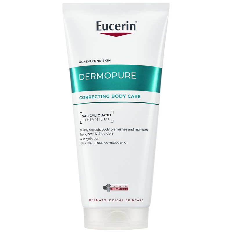 Eucerin DermoPure Correcting Body Care on vartalolle tarkoitettu hoitovoide, joka on suunniteltu vähentämään epäpuhtauksia sekä tasoittamaan aknen jälkeisiä tummia läiskiä. Voiteen teho perustuu salisyylihapon (BHA) ja patentoitujen Thiamidol®-ainesosan yhdistelmään, jonka on kliinisesti todistettu tasoittavan ihon sävyä ja ehkäisevän värimuutosten uudelleen muodostumista. Skvaleeni ja kosteuttavat ainesosat rauhoittavat ihoa ja auttavat säilyttämään sen kosteustasapainon jopa 48 tunnin ajan.