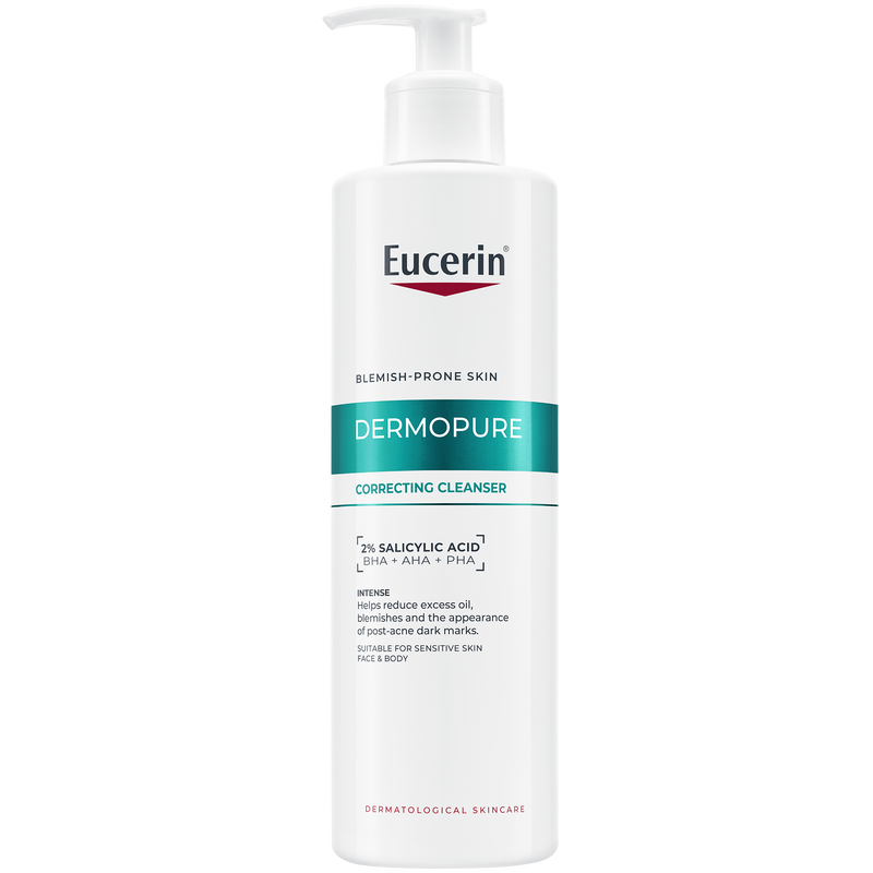 Eucerin DermoPure Correcting Cleanser on tehokas puhdistusgeeli rasvoittuvalle ja akneen taipuvaiselle iholle. Sen kolminkertainen happoyhdistelmä — 2 % salisyylihappo (BHA), glykolihappo (AHA) ja glukonolaktoni (PHA) — kuorii ihoa hellävaraisesti, vähentää näkyviä epäpuhtauksia ja auttaa tasoittamaan aknen jälkeisiä tummia läiskiä. Kliinisesti testattu koostumus auttaa tukemaan ihon mikrobiomin tasapainoa ja jättää ihon puhtaan ja raikkaan tuntuiseksi ilman kiristävää tunnetta.