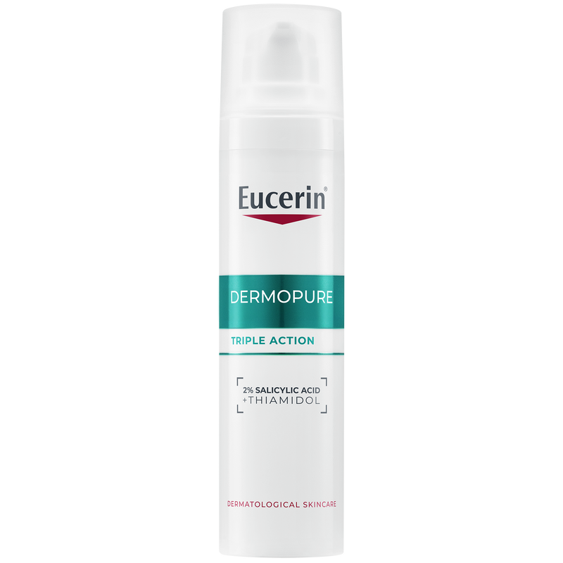 Eucerin DermoPure Triple Action on öljytön seerumi, joka on suunniteltu rasvoittuvalle ja akneen taipuvaiselle iholle. Seerumi auttaa vähentämään näkyviä epäpuhtauksia, tasoittaa ihonsävyä ja häivyttää aknen jälkeen jääneitä tummia läiskiä. Koostumus sisältää salisyylihappoa (BHA), joka kuorii ihoa hellävaraisesti ja auttaa pitämään ihohuokoset puhtaampina sekä vähentämään komedoneja.