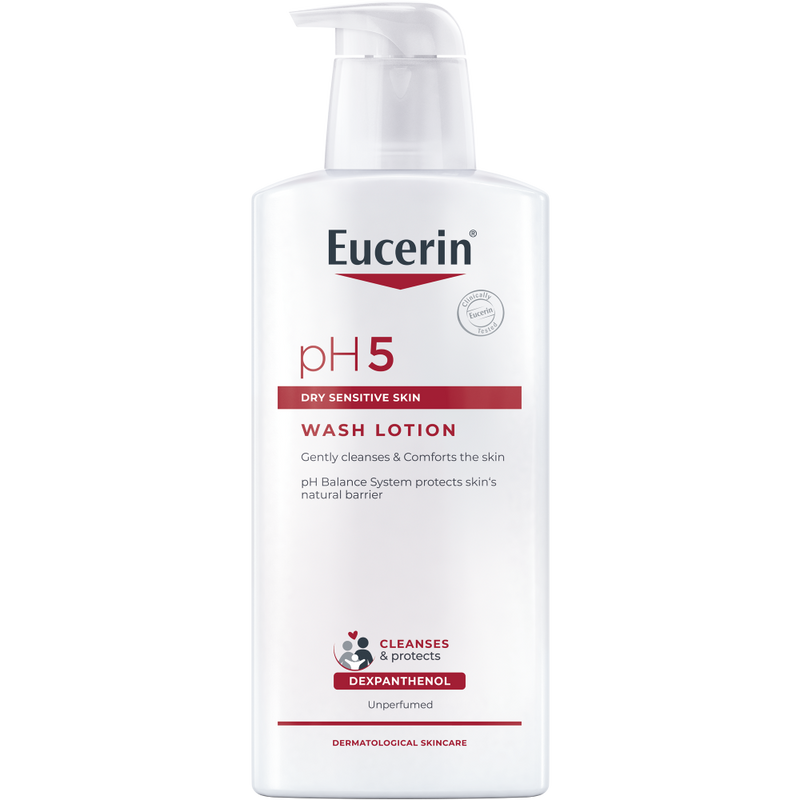 Eucerin pH5 Washlotion on kuivalle ja herkälle iholle tarkoitettu hajusteeton, hellävarainen ja saippuaton pesuvoide, joka puhdistaa ihoa tehokkaasti mutta lempeästi, auttaa ylläpitämään ihon luonnollista suojamuuria ja sopii lapsille 1 kuukauden ikäisestä alkaen.