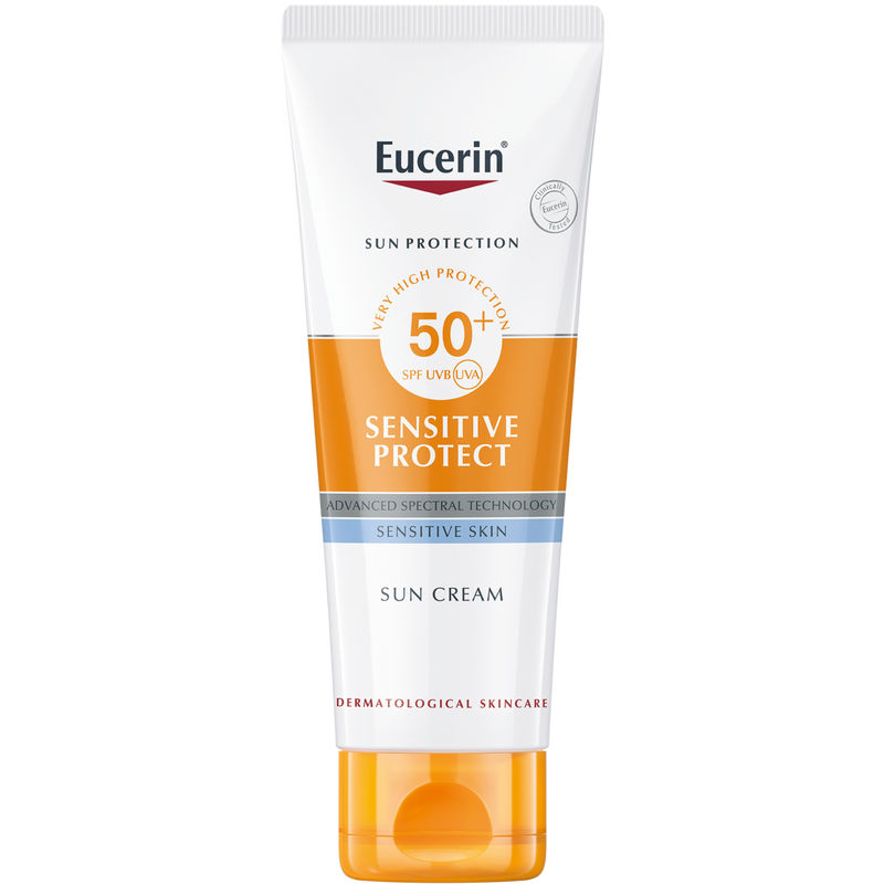 Eucerin Sun Face Sensitive Protect Cream SPF50+ tarjoaa erittäin korkean UVB/UVA‑suojan sekä suojan siniseltä valolta ja ilmansaasteilta. Rauhoittava voide sopii erityisesti kuivalle ja herkälle iholle.