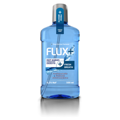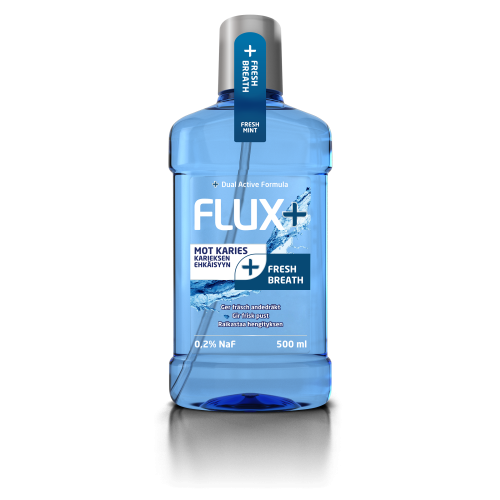 Flux+ Fresh Breath -suuvesi tekee tuplataikoja! Tämä raikkaan mintun makuinen kaksivaikutteinen suuvesi ei ainoastaan raikasta hengitystäsi, vaan myös vahvistaa hampaitasi ja torjuu kariesta.