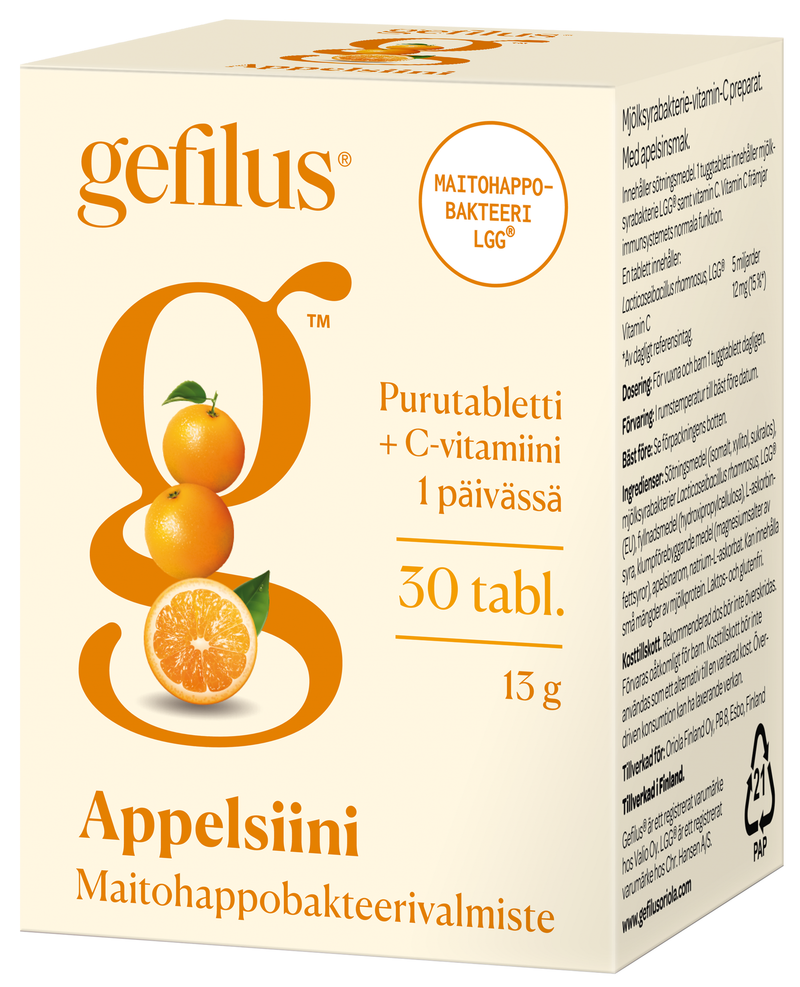 Maailman tutkituinta Lactobacillus Rhamnosus (LGG®) -maitohappobakteeria sisältävä appelsiinin makuinen maitohappobakteeripurutabletti, mukana myös vastustuskyvyn normaalia toimintaa edistävää C-vitamiinia.