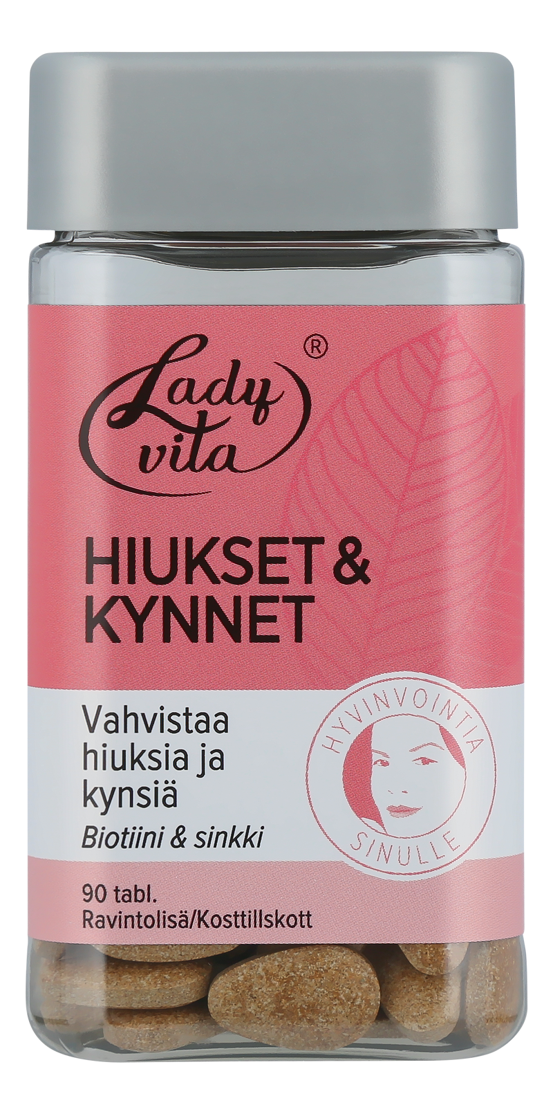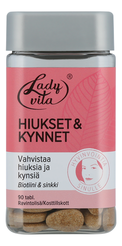Ladyvita Hiukset & kynnet on peltokorte-oluthiiva-vitamiini-kivennäisainevalmiste, joka sisältää hiuksia ja kynsiä vahvistavia ravintoaineita: Biotiini ja sinkki edistävät hiusten pysymistä normaaleina ja sinkki myös kynsien pysymistä normaaleina. Kupari tukee hiusten normaalia pigmentoitumista.