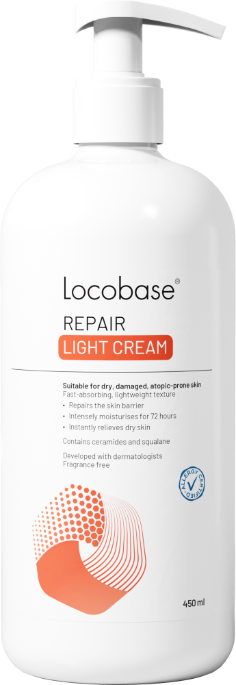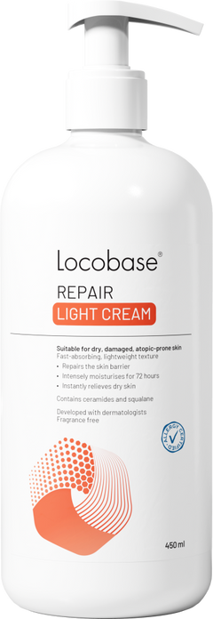 Locobase Repair Light Cream on nopeasti imeytyvä kevyen koostumuksen voide, joka on kehitetty erityisesti kuivalle, vaurioituneelle ja atooppiseen ihottumaan taipuvaiselle iholle. Ihotautilääkäreiden kanssa kehitetyn kevyen voiteen on kliinisesti todistettu korjaavan ihon suojakerrosta nopeasti ja vähentävän ihon halkeilua ja kuivuutta. Locobase Repair Light Cream sisältää yhdistelmän lipidejä ja ihoidenttisiä keramideja ja skvalaania, sekä rauhoittavaa allantoiinia, joka syväkosteuttaa, lukitsee kosteuden ihoon ja palauttaa ihon terveyden. Locobase Repair Light Cream -voide sopii kasvoille ja vartalolle. Se sisältää huolellisesti valittuja ainesosia, jotka ovat hellävaraisia kuivalle, ärtyneelle ja herkälle iholle. Hajusteeton ja allergiasertifioitu, hypoallergeeninen.