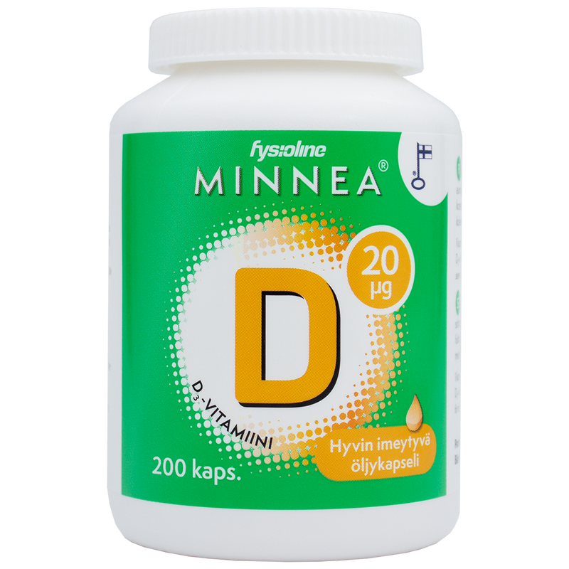 Kotimainen Minnea D-vitamiinivalmiste auringonkukkaöljyä sisältävässä kapselissa. D-vitamiini edistää kalsiumin normaalia imeytymistä, mistä syystä se on tärkeä niin luuston kuin hampaidenkin kunnolle. Se edistää myös immuunijärjestelmän normaalia toimintaa ja myös lihastoiminnan ylläpitämisessä D-vitamiinilla on myös osuutensa.