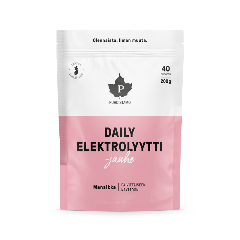 Puhdistamon Daily Elektrolyyttijauhe on raikas ja hyvänmakuinen janonsammuttaja, joka auttaa ylläpitämään kehon optimaalista nestetasapainoa. Se on suunniteltu päivittäiseen käyttöön ja sopii nautittavaksi esimerkiksi aamulla herättyäsi, työpäivän aikana ja liikunnan yhteydessä. Tuote sisältää natriumin lähteenä toimivan Guérande-merisuolan sekä muiden keskeisimpien elektrolyyttien lisäksi myös C-vitamiinia.