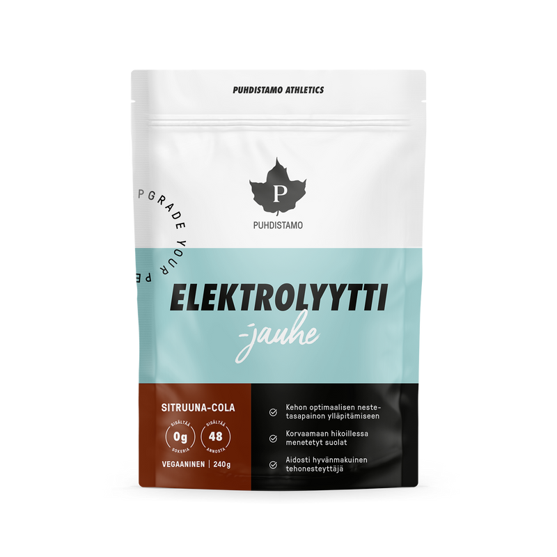 Puhdistamon elektrolyyttijauhe on sokeriton, kokonaisvaltainen ja herkullisen makuinen juomajauhe, joka auttaa pitämään yllä tarpeellisten elektrolyyttien tasapainoa elimistössämme. Se sisältää natriumin lähteenä toimivan Guérande-merisuolan sekä muiden keskeisimpien elektrolyyttien lisäksi muun muassa C-vitamiinia sekä orgaanista rikkiä (OptiMSM®).