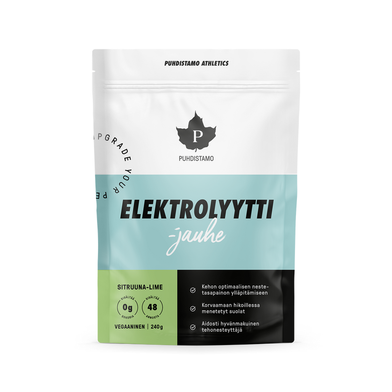 Puhdistamon elektrolyyttijauhe on sokeriton, kokonaisvaltainen ja herkullisen makuinen elektrolyyttijuomajauhe, joka auttaa pitämään yllä tarpeellisten elektrolyyttien tasapainoa elimistössämme. Se sisältää natriumin lähteenä toimivan Guérande-merisuolan sekä muiden keskeisimpien elektrolyyttien lisäksi muun muassa C-vitamiinia sekä orgaanista rikkiä (OptiMSM™). Tuote soveltuu käytettäväksi nesteytykseen aina kun hikoilemme esimerkiksi urheillessa, saunoessa tai kuumana kesäpäivänä. Yksi annos sisältää vain 0,1 g hiilihydraatteja. Vegaaninen tuote.