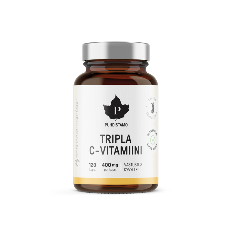 Puhdistamon Tripla C-vitamiini yhdistää kolme tehokasta C-vitamiinin muotoa yhdessä Camu camu -marjajauheen ja sitrusbioflavonoidien kanssa. Etelä-Amerikan sademetsissä kasvavaa Camu camu -marjaa pidetään C-vitamiinipitoisimpana marjana. C-vitamiini auttaa vähentämään väsymystä ja uupumusta, jonka lisäksi C-vitamiini edistää immuunijärjestelmän normaalia toimintaa ja edistää immuunijärjestelmän toiminnan pysymistä normaalina myös raskaan liikunnan yhteydessä. Lisäksi C-vitamiini edistää normaalia kollageenin muodostumista ihon, luuston, verisuonten ja rustojen normaalia toimintaa varten sekä lisää raudan imeytymistä.