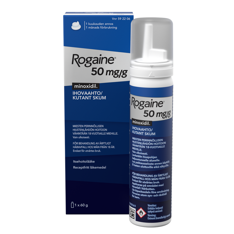 Rogaine sisältää minoksidiilia. Minoksidiili lisää uusien hiusten kasvua ja ehkäisee hiustenlähtöä elvyttämällä karvatuppeja miehillä, joilla hiusraja pakenee ja päälaki kaljuuntuu. Ei alle 18-vuotiaille lapsille ja nuorille.