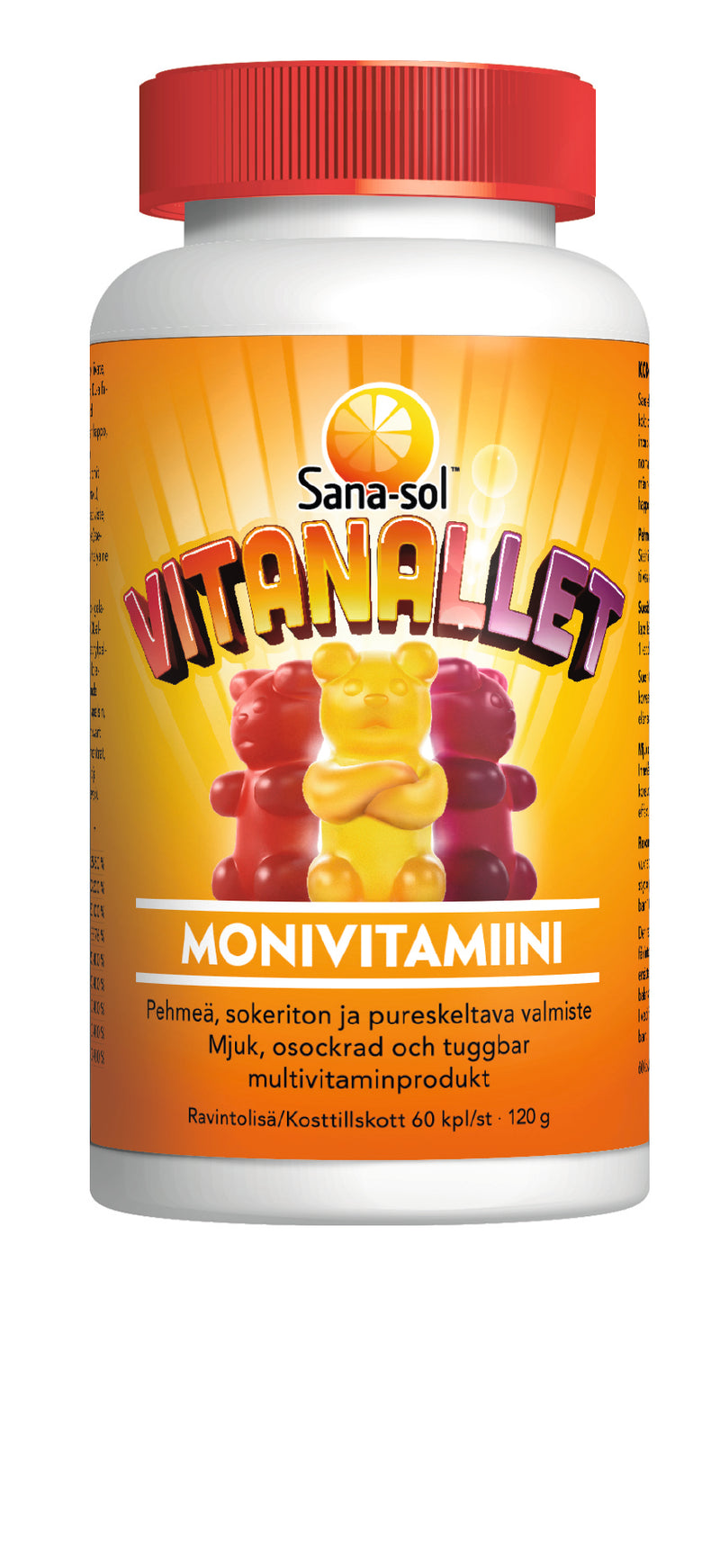 Sana-sol vitanallet ovat hyvänmakuinen, pureskeltava monivitamiinivalmiste. Se sisältää 9 eri vitamiinia helposti otettavassa muodossa.