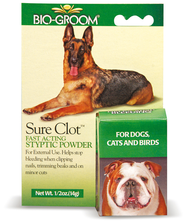Bio-Groom SureClot-tyrehdytyspulveri on kehitetty erityisesti kynsien leikkauksen yhteydessä esiintyvän verenvuodon tyrehdyttämiseen. Voidaan käyttää myös pienten pintahaavojen hoitoon tai lintujen nokan typistyksessä esiintyvän verenvuodon tyrehdyttämiseen.