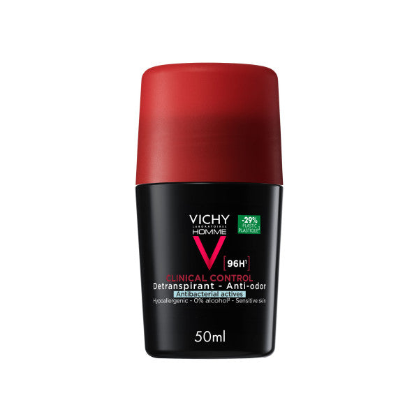 Vichy Clinical Control Roll-on Antiperspirant miehille vaikuttaa 96 tuntia* jopa voimakkaan hikoilun aikana. Sisältää sinkkiä, jolla on antibakteerisia ominaisuuksia ja joka auttaa tehokkaasti poistamaan pahan hajun. Sopii herkälle iholle. Vichy Clinical Control Roll-on Antiperspirant Deodorant –antiperspirantti miehille vaikuttaa 96 tuntia* jopa voimakkaan hikoilun aikana. Koostumus sisältää runsaasti hikoilua hillitseviä aktiivisia ainesosia ja antibakteerista sinkkiä, joka auttaa poistamaan epämiellyttävää hien hajua. Tekee ihosta pehmeämmän ja suojaa tehokkaasti hikoilulta. Raikas ja mieto tuoksu.